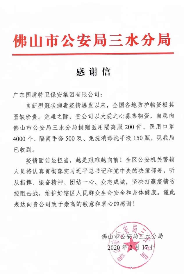 三水區公安分局特向廣東國盾特衛保安集團有限公司發來了感謝信,感謝國盾特衛保安集團具有社會責任擔當的大愛精神!區公安分局領導負責人代表向三水區禁毒協會、廣東國盾特衛保安集團有限公司表示感謝,并要求全體參戰警輔人員,越是危難時刻越要勇于擔當、忠誠履職,不辱使命、不負眾望,堅決打贏疫情防控阻擊戰,讓人民群眾安心放心。