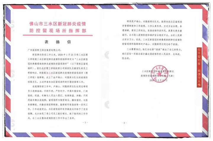 2月22日下午,集團公司收到一份來自佛山市三水區新冠肺炎疫情防控留觀場所指揮部發來的表揚信,高度贊譽了我司保安員在當前疫情防控工作中英勇無畏負重前行,能打硬仗、連續奮戰、盡職盡責、敢于擔當的工作作風,在三水區整體疫情防控工作中作出了表率。