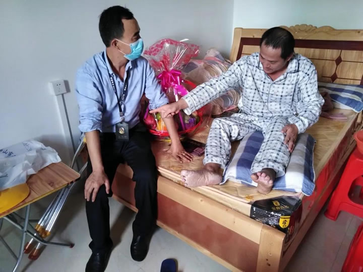 2月29日下午,國盾特衛保安服務集團公司監察部部長楊劍、服務管理部副部長辜操全來到南海區官窯石布塘村看望前期受傷的保安隊員孫漢垣,之前因為疫情防控封村未能及時慰問,現在登記后可進入村中探望。