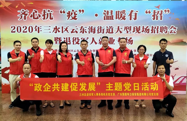 為貫徹落實(shí)上級有關(guān)部門的決策部署,強(qiáng)化黨組織之間的交流合作,把“政企共建促發(fā)展”的工作落到實(shí)處,促進(jìn)資源共享、優(yōu)勢互補(bǔ),助推退役軍人就業(yè)創(chuàng)業(yè),進(jìn)一步搭建退役軍人與企業(yè)的雙向交流平臺。9月19日當(dāng)天,三水區(qū)退役軍人事務(wù)局黨支部、廣東國盾特衛(wèi)保安集團(tuán)有限公司黨支部在三水萬達(dá)廣場開展合作共建主題黨日活動暨舉辦退役軍人專場招聘會。