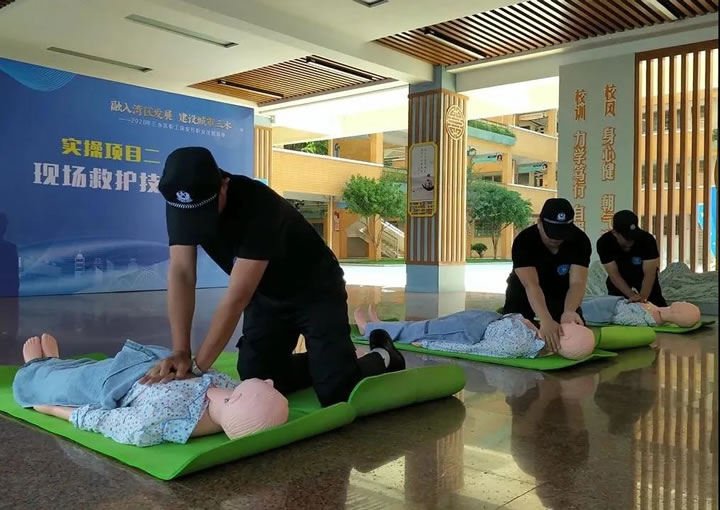 “快來人呀,有人暈倒了,請幫忙撥打120,有會救護的趕快來幫忙。” 現場救護技能的考核項目為模擬單人徒手成人心肺復蘇,只見參賽選手發現病人暈倒后,迅速呼叫并判斷病人呼吸和脈搏,通過人工呼吸和胸外心臟按壓進行急救,展現出正確、有效的復蘇操作流程。