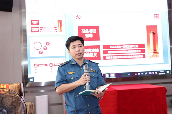 其后,湛江市交通運(yùn)輸局執(zhí)法一科科長(zhǎng)付雪松同志帶領(lǐng)大家一起回顧了黨的百年發(fā)展歷程,共同追憶崢嶸歲月、感悟初心使命,引導(dǎo)黨員切實(shí)增強(qiáng)責(zé)任擔(dān)當(dāng),做到知史愛黨、知史愛國(guó),黨中央有號(hào)召、共產(chǎn)黨員有行動(dòng)。付雪松同志講述到:近代以來,在中國(guó)和世界舞臺(tái)上政黨繁多,難以數(shù)計(jì),但是像中國(guó)共產(chǎn)黨這樣,成立百年,引領(lǐng)中華民族站起來、富起來、強(qiáng)起來。付雪松科長(zhǎng)結(jié)合視頻、圖片等資料分別從新民主主義革命時(shí)期、社會(huì)主義革命和社會(huì)主義建設(shè)時(shí)期、改革開放和社會(huì)主義現(xiàn)代化建設(shè)時(shí)期系統(tǒng)回顧了革命戰(zhàn)爭(zhēng)年代的艱苦創(chuàng)業(yè)史和新中國(guó)發(fā)展壯大的光輝歷程,學(xué)習(xí)我們黨和國(guó)家的基本歷史經(jīng)驗(yàn)。付雪松科長(zhǎng)強(qiáng)調(diào),2020年突如其來的新冠疫情,是對(duì)國(guó)家治理體系和治理能力現(xiàn)代化一次大考,在以習(xí)近平同志為核心的黨中央堅(jiān)強(qiáng)領(lǐng)導(dǎo)下,常態(tài)化疫情防控和經(jīng)濟(jì)社會(huì)發(fā)展“雙統(tǒng)籌”穩(wěn)步走向“雙勝利”,彰顯“中國(guó)之治”生動(dòng)實(shí)踐和顯著優(yōu)勢(shì)。