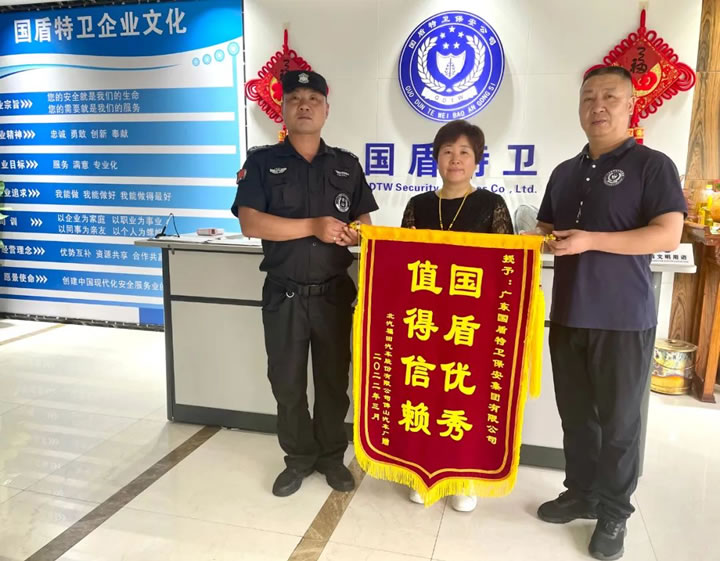 一直以來,國盾特衛保安集團領導班子高度重視對基層保安隊員的培訓和綜合素質提升,著重抓好基層保安服務隊員的職業形象以及在崗紀律,從而打造保安服務品牌。近期,集團公司多名保安員受到客戶單位點贊并獲得錦旗,表達對駐點保安隊員高度負責、細致入微的服務的感謝。