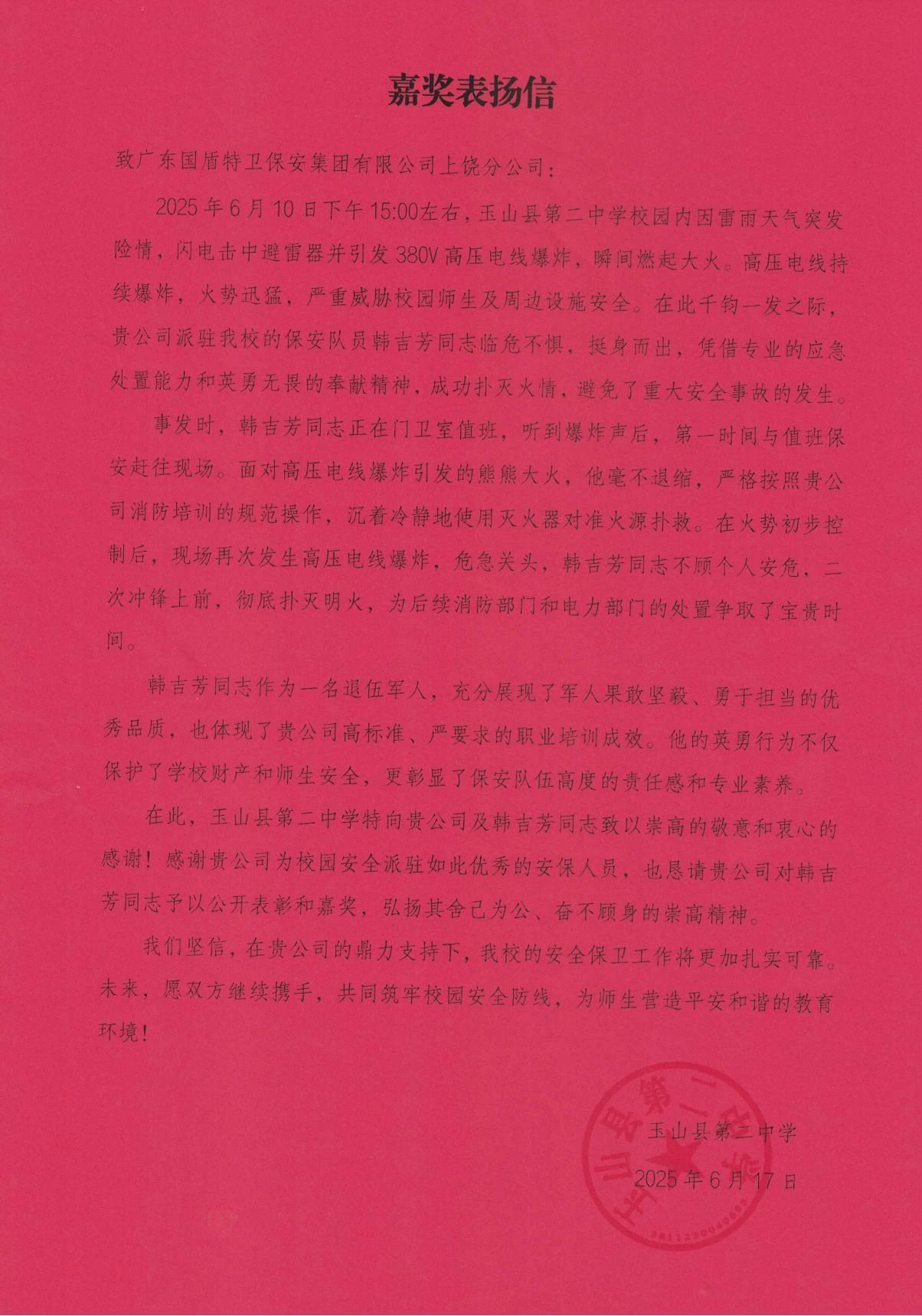 韓吉芳同志的事跡傳開后,社會(huì)各界紛紛點(diǎn)贊。玉山二中特發(fā)來感謝信和贈(zèng)與錦旗并對韓吉芳同志進(jìn)行表彰,高度贊揚(yáng)其"軍人本色與職業(yè)精神的完美融合"。正如該校黨委書記程美榮所言:"他不是超人,卻用平凡之軀守護(hù)了我們的平安。"集團(tuán)公司隨即啟動(dòng)專項(xiàng)表彰程序,號召全體保安員學(xué)習(xí)他"危急時(shí)刻豁得出、關(guān)鍵時(shí)刻頂?shù)蒙?quot;的擔(dān)當(dāng)精神。
